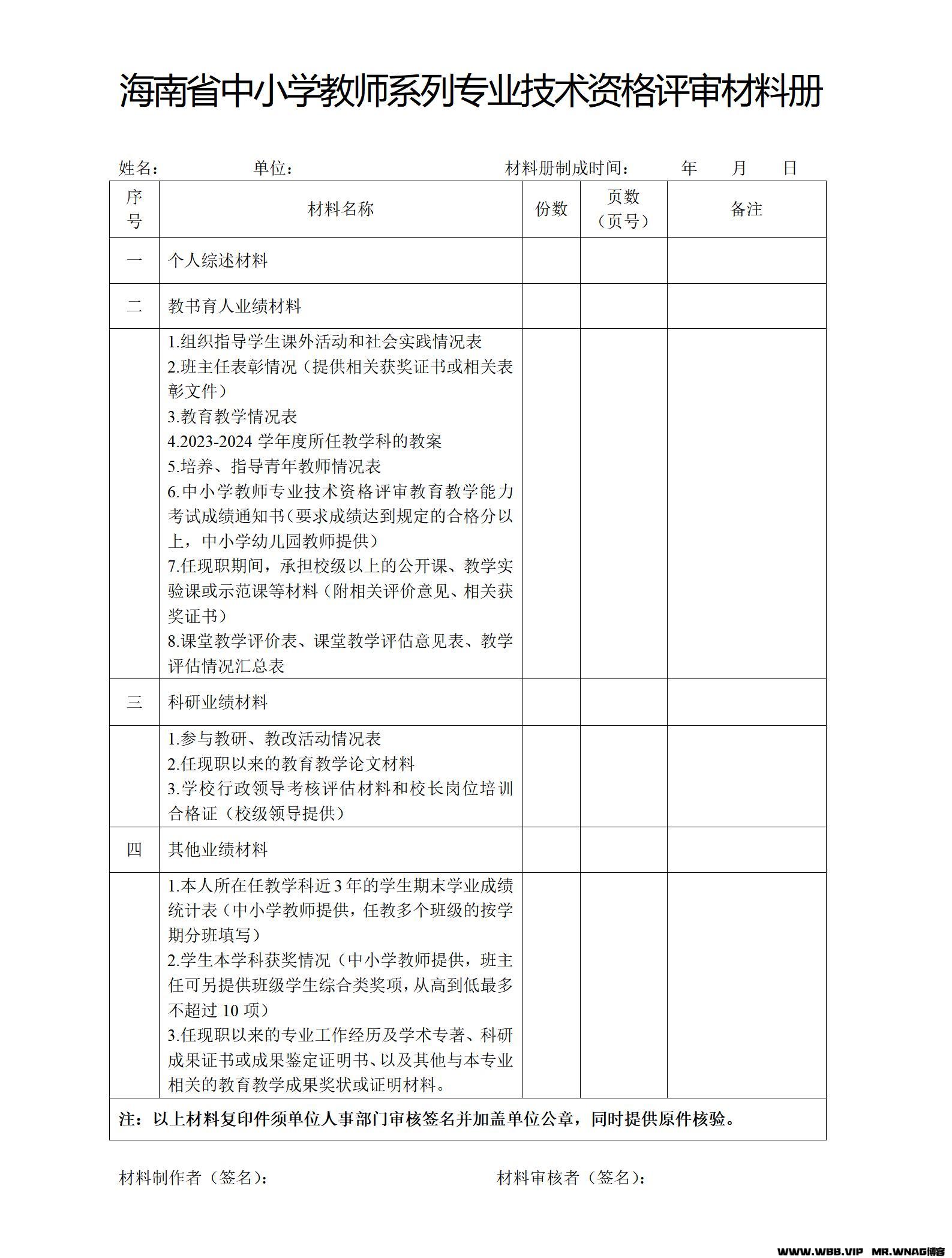 看起来很负责,其实也不简单。现在海南省由各市县评之后,变得更加的麻烦了。一级和高级的材料差不多。只不过一级只要一篇论文。那么如何准备材料呢?第一,根据下面这个文件“评审材料册”准备好相关材料,然后按照相应顺序排列整齐。这个材料搞定。第二,按照“条件材料册”准备好材料编订成册,搞定。特别说明:1.高级教师公开课在一级职称之后至少要上三节,都要有《海南省中小学教...