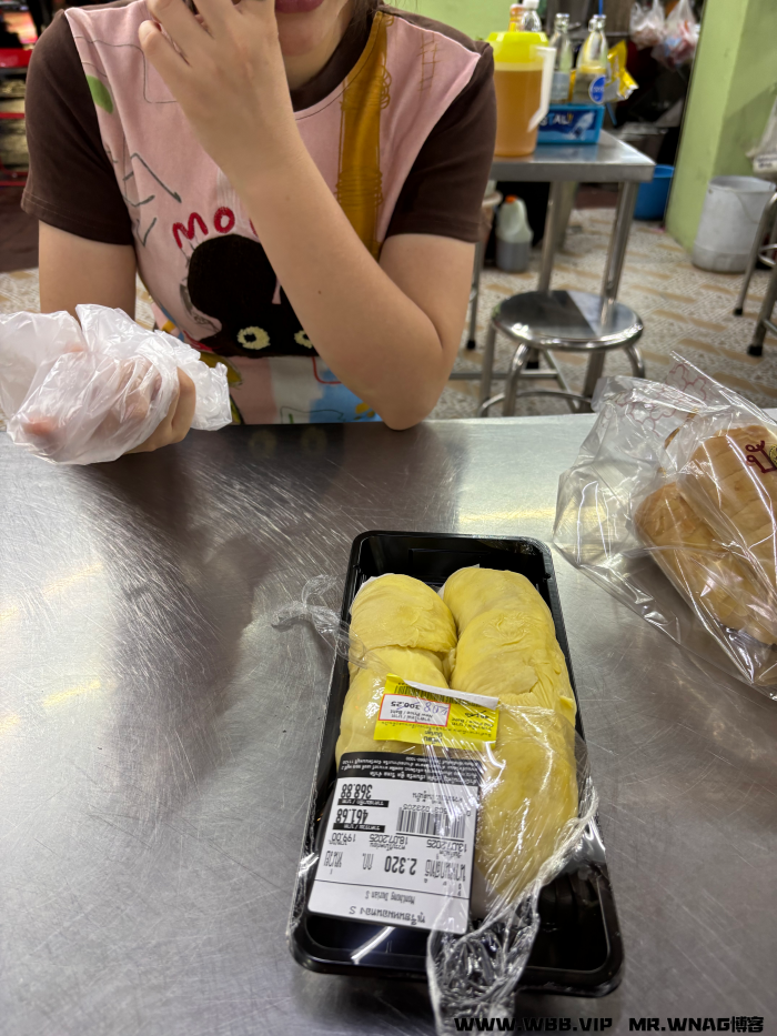 晚上又去了昨天哪家餐厅吃炒饭,老婆又吃粉,买了榴莲在餐厅吃,贱老板捏着鼻子暗示我们,我们发现餐厅贴了不能吃榴莲,自己羞愧难当,我没看见。榴莲买多了,最后坐在酒店下面吃了半天。我的妈。